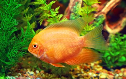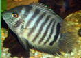 Nombre Científico: Heros Severus.Nombre Común: Cíclido de Franjas.CaracterísticasDistribución: América del Sur en la cuenca del Amazonas y en ríos de Colombia, Guayana y Venezuela.Habitat: Zonas con troncos y ramas sumergidas.Morfología: Cuerpo ovalado y comprimido lateralmente.Coloración: Cuerpo de coloración salvaje base grisácea con bandas verticales más oscuras por todo el cuerpo. Hay otras variedades como la roja o la amarilla.Tamaño: Unos 20 cm.Esperanza de vida: De media unos 10 años en condiciones óptimas.Dimorfismo Sexual: Los machos son más grandes y muestran colores más intensos que las hembras.Mantenimiento en CautividadAcuario: Mínimo 200 litros para una pareja. Decoración con muchos escondites y refugios. Recomendada arena fina como sustrato y plantas robustas.Iluminación: Adecuar en función de las plantas.Agua: pH entre 5.0 y 6.5 y dureza de 5 a 7 dGH.Temperatura: Entre 24ºC y 28ºC.Alimentanción: En la naturaleza se alimentan de invertebrados y materia vegetal. En nuestro acuario les ofreceremos de dieta base alimento completo para cíclidos (especial importancia a las vitaminas de dicho alimento) y complementaremos con aporte vegetal.Les daremos trozos de pescado crudo y larva roja para variarles la dieta.Etología:Comportamiento: Se trata de un pez pacífico adecuado para acuarios comunitarios.Compañeros de acuario: Lo podemos juntar con peces de su misma talla si disponemos del espacio necesario. Todo pez que le quepa por la boca será parte de su dieta.Reproducción: Viable aun que no es fácil, paso a paso: 1.- Debemos contar con una pareja madura sexualmente. 2.- Los padres limpiarán una piedra plana y la hembra pondrá unos 400 huevos para que el macho los fecunde. 3.- Los padres su turnarán para cuidar a los huevos y posteriormente a los alevines. Nunca dejarán a su prole desportegida. 4.- Cuando naden libremente les ofreceremos nauplio de artemia.